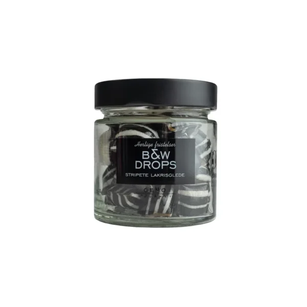 Stripete lakrisglede. Deilige lakrisdrops i hvitt og sort.